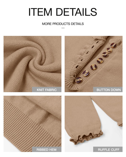 BTFBM 2024 Womens Sweaters Fall Winter Outfits Long Sleeve Button Down Ruffle Crew Neck Casual Knitted Pullover Tops(Solid Khaki, Medium)